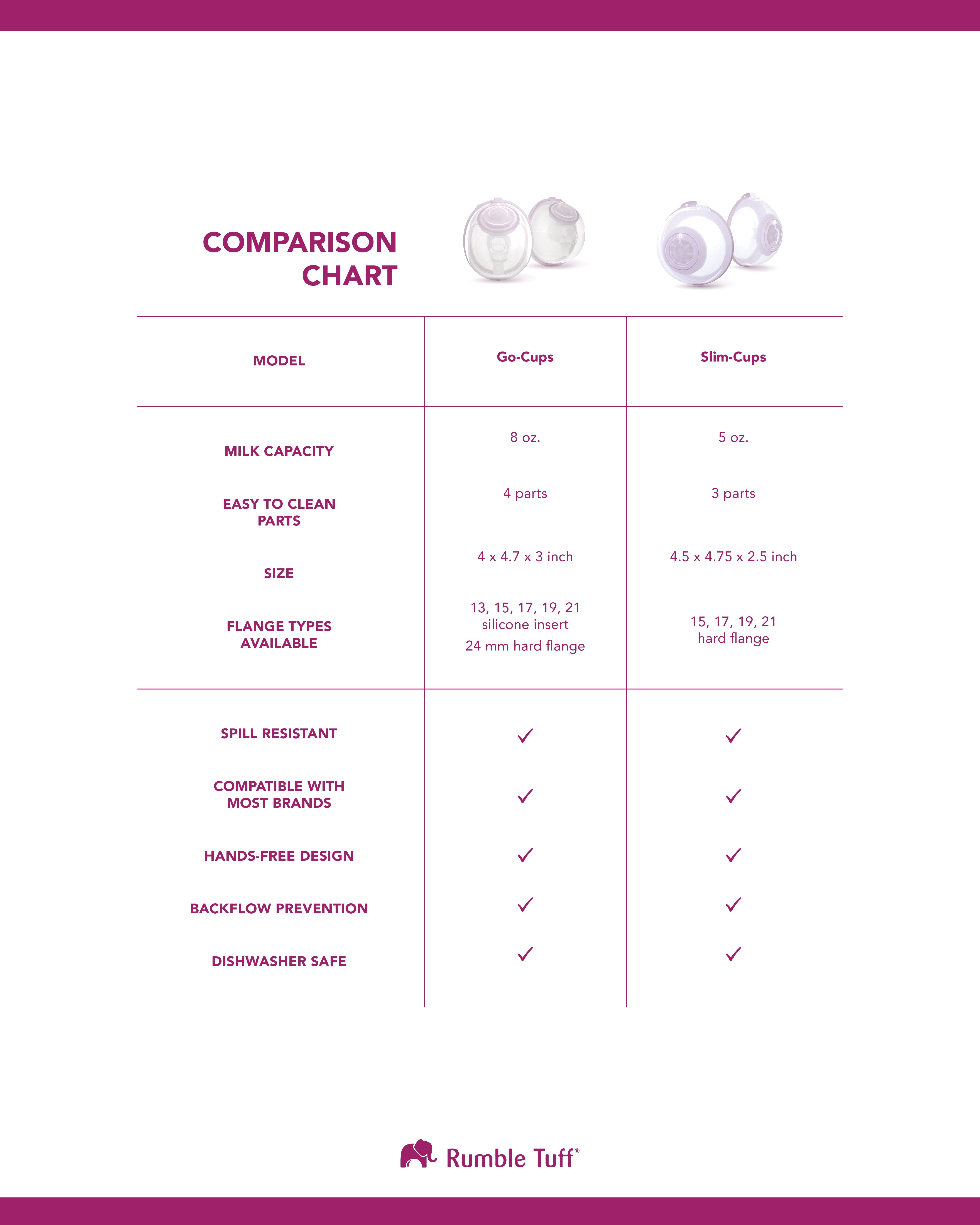 ¡Las Go-Cups Rumble Tuff son increíbles! Son súper fáciles de limpiar, solo son 4 piezas y tienen mucha capacidad sin ser grandes ni voluminosas. Tengo una enorme colección de extractores y me encanta poder usar las Go-Cups con tantos diferentes. La forma también es genial, no es la típica forma circular. Se las recomiendo a cualquier mamá que quiera que sus extractores sean más portátiles y fáciles de usar.